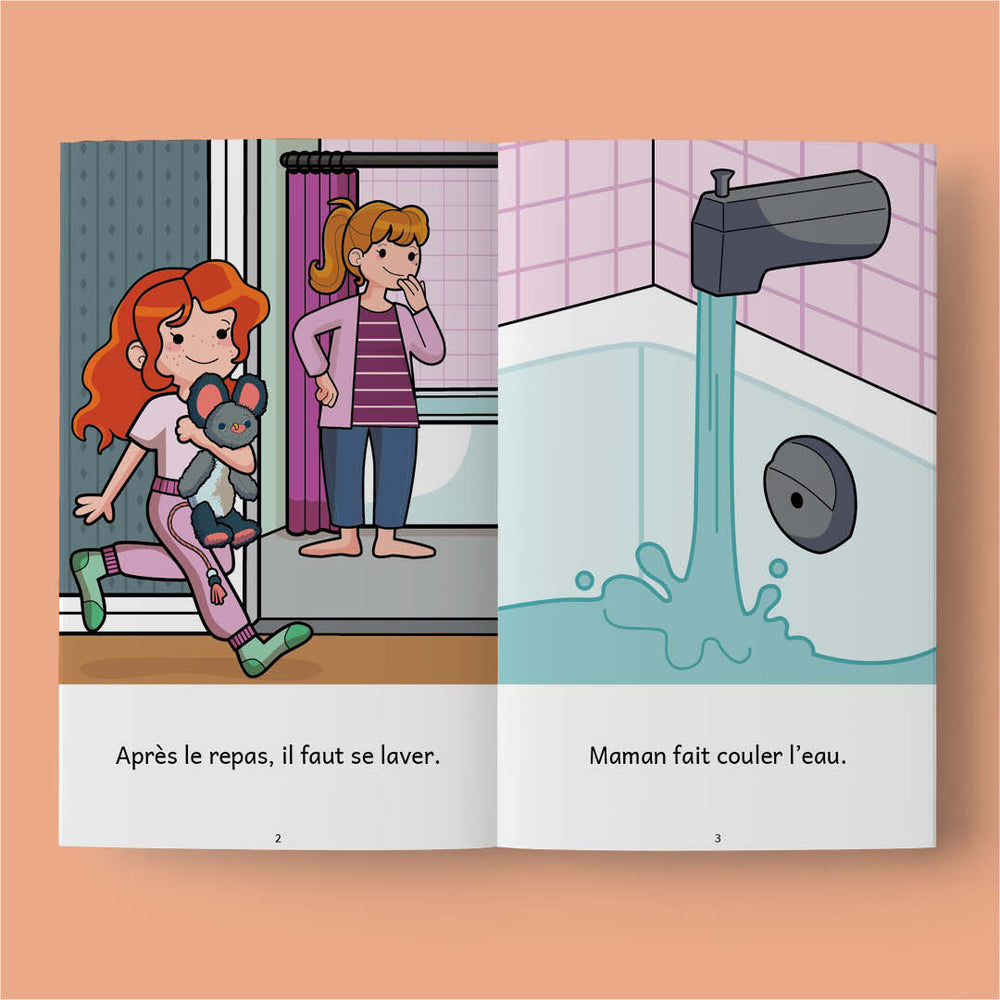 L’heure du lever, L’heure du petit-déjeuner, L’heure du départ pour l’école, L’heure du bricolage, L’heure de la récré, L’heure de manger, L’heure du retour à la maison, L’heure du bain, L’heure du conte, L’heure de dormir.